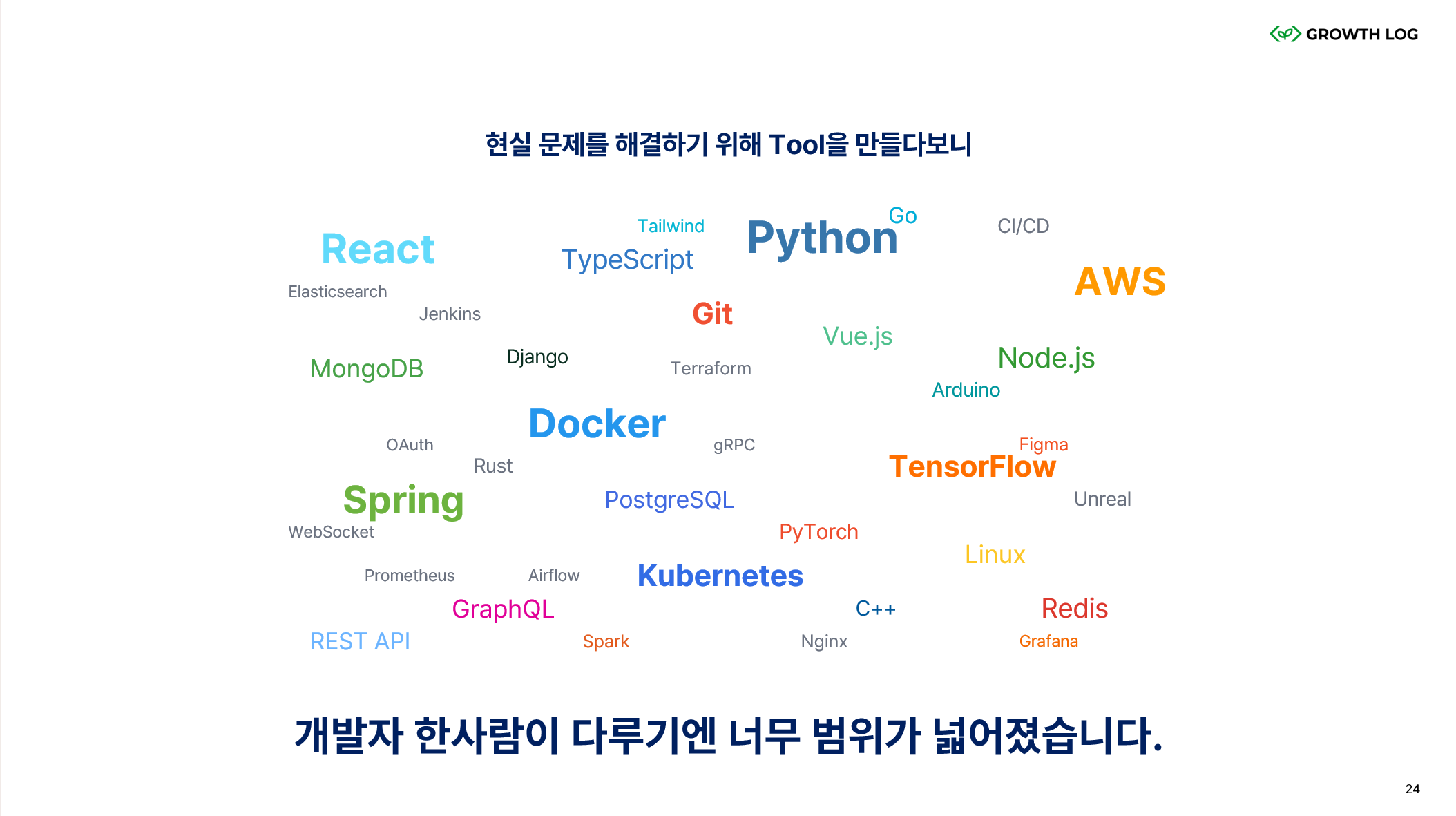 그런데 현실 문제를 해결하기 위해 Tool을 만들다보니, 개발자 한 사람이 다루기엔 너무 범위가 넓어졌습니다. React, Python, Docker, AWS, TensorFlow, Kubernetes, Spring, Flutter... 이걸 한 사람이 다 할 수 있을까요?
